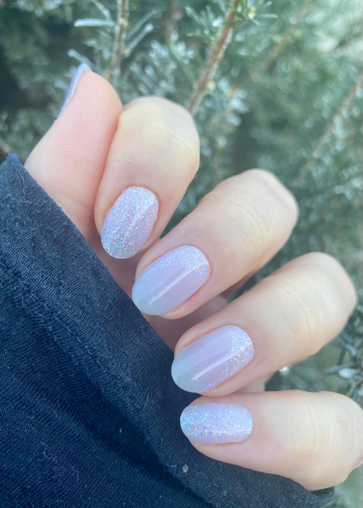 Transparent/milchig , Farbverlauf zu grau, Glitzer (Tragebild mit Farblack drunter)